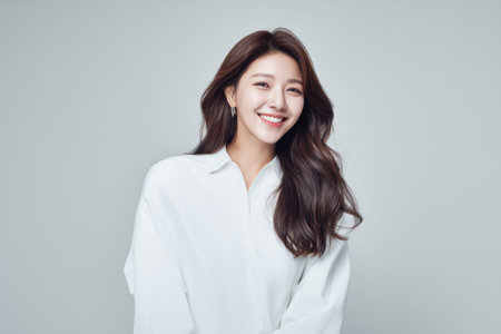 Young adult healthy beautiful Asian woman model wearing white t-shirt on background. Face flawless perfect fresh skin care korean cosmetic treatment makeup products skincare ads. Beauty portrait.