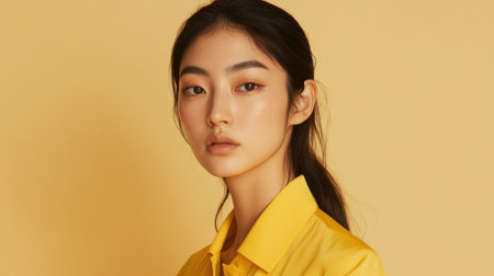 A model portrait of a young Asian woman in yellow office wear, exuding confidence and style, with space for text in an ad campaign.