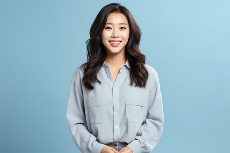 Beautiful asian woman smiling and looking at camera isolated on blue background.