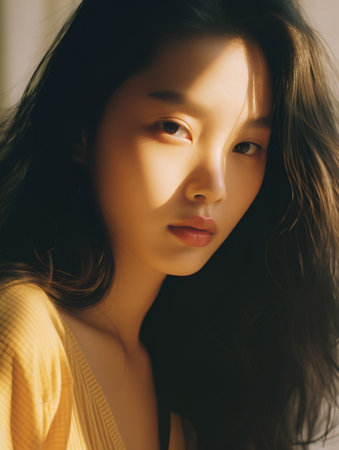 beautiful asian woman with long black hair in yellow sweater looking at camera