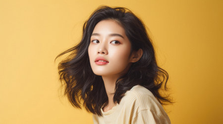 Portrait of a beautiful young Asian woman on yellow background.