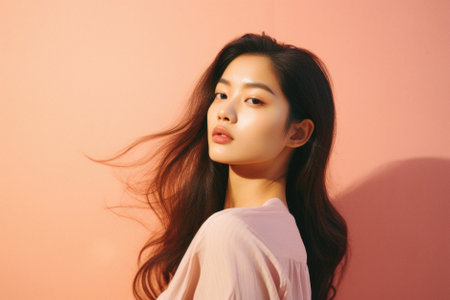 Portrait of beautiful Asian woman with long hair on pink background.