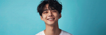 Asian man in white t-shirt smiling with confidence on blue background.