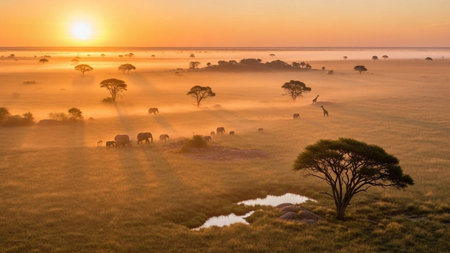 In the tranquil savannah, a family of elephants walks gracefully, stirring up dust as the sun sets. A lone acacia tree stands tall, adding beauty to the vast golden landscape in the background.