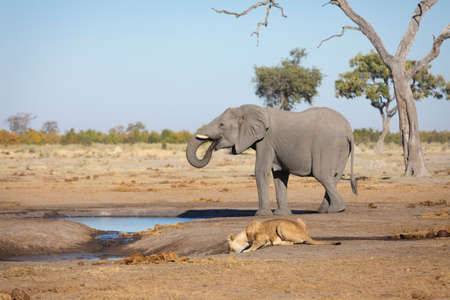 Elephant and female lion drinking water from a waterhole in Chobe National Park in Botswana