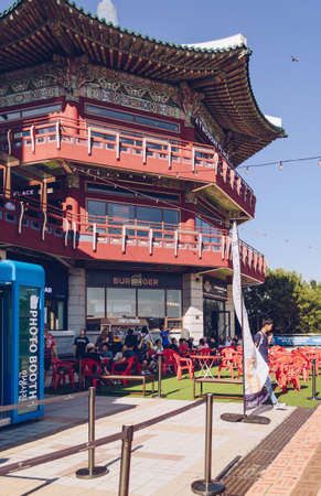 Busan, South Korea, September 14, 2019: traditional korean pavilion with cafes and shops near Busan tower