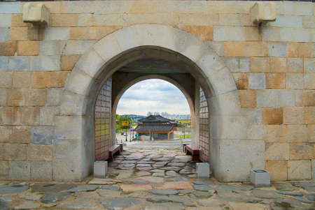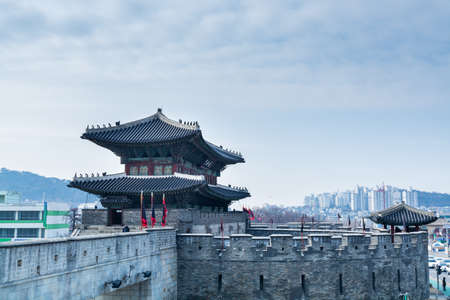 Suwon, Korea - September 02, 2008 : Exterior of the entrance gate of the Hwaseong fortress (Brilliant Fortress) in Suwon, South Korea. Built in the late 18th century, UNESCO World Heritage Site.