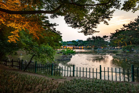 Gyeongju, South Korea - June 5, 2019: Framed view of one pavilion of the Donggung Palace reflecting into the Wolji Pond, shot at dusk