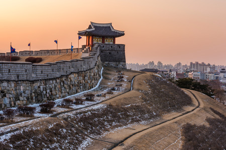 Hwaseong Fortress in Sunset, Traditional Architecture of Korea at Suwon, South Korea.