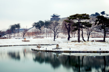 Korean traditional architecture Hwaseong Fortress Banghwasuryujeong at winter in Suwon, Korea