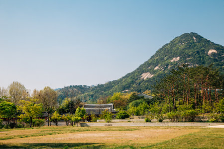 Gyeongbokgung Palace, Seoul, Jongno District, South Korea, in a spring sunny day, exterior view of main Korean royal palace in Cherry Blossom season, with Bugaksan mountain in the background