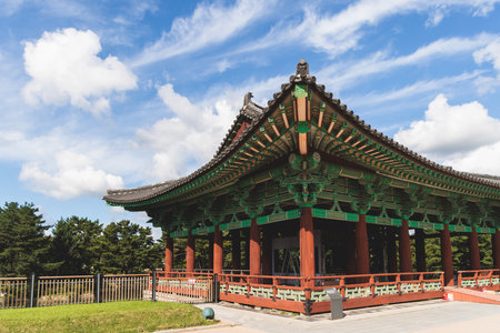 Gyeongju, South Korea, view of Donggung Palace and Wolji Pond in a sunny day, North Gyeongsang Province, Gyeongju city, Silla dinasty traditional Korean hanok architecture, Yeongnam region