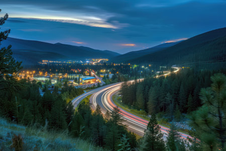 A long exposure photograph captures the essence of a highway at sunset. The image showcases the streaks of light from moving vehicles, creating a mesmerizing trail of colors against the backdrop of a vibrant sunset. The sky is painted with hues of orange, pink, and blue, while the silhouette of distant mountains adds depth to the scene. The highway stretches into the horizon, symbolizing a journey ahead.