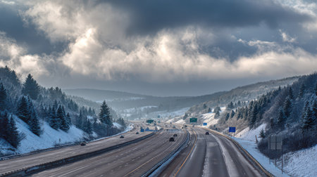 Dangerous covered roads and hazardous winter weather along a high rocky mountains I-40 road in winter with snow covered landscape in the New Mexico