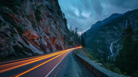 A magical view of light trails on the scenic byway surrounded by towering cliffs and majestic waterfalls