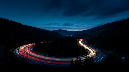 Long exposure photo of glowing car light trails illuminating a winding mountain road at dusk, creating a mesmerizing scene of movement and light
