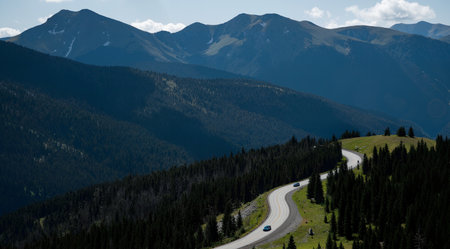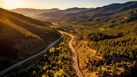 Aerial view of a scenic highway surrounded by mountains, showcasing nature's beauty. Perfect for travel themes, road trips, and outdoor adventures.