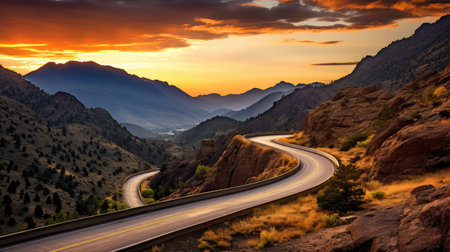 This stunning image captures a picturesque highway bathed in vibrant colors during sunset. The road reflects the hues of the sky, creating a serene travel experience.
