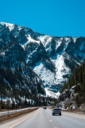 Scenic road through the Canadian Rockies, surrounded with rocky mountains. Taken in Banff National Park, Alberta, Canad.