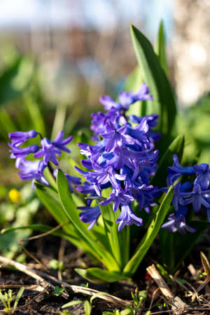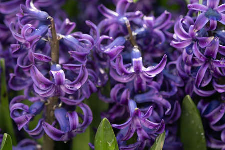 Purple hyacinths (Hyacinthus orientalis) in the garden. Blooming in early spring.