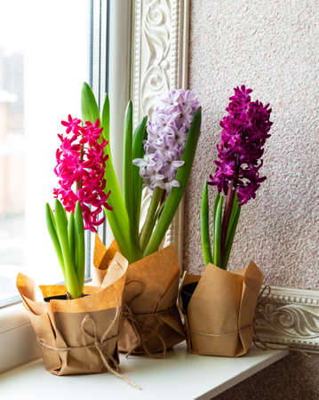 Flowers composition with lilac and pink hyacinths potted near window. March 8, Easter, Mothers Day