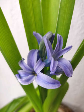 Blue fresh spring hyacinth flower with green leaves on natural background