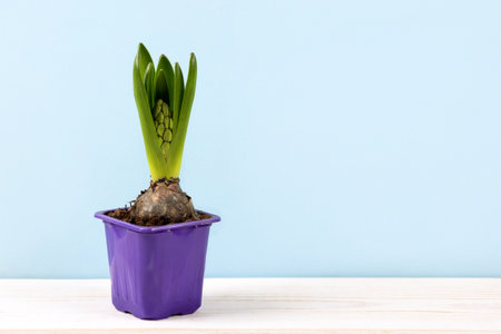 Spring hyacinth flower in a pot with a bud on the table. Home cultivation of primroses. The concept of spring and the first flowers