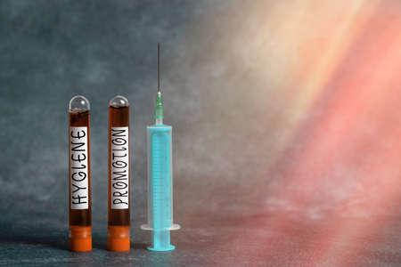 Handwriting text Hygiene Promotion. Conceptual photo systematic program to prevent related disease with sanitation Extracted blood sample vial with medical accessories ready for examination