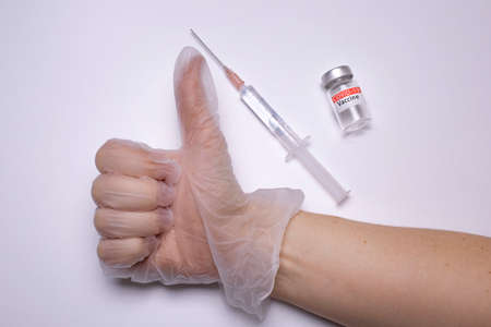 Hand thumbs up with vaccine on white