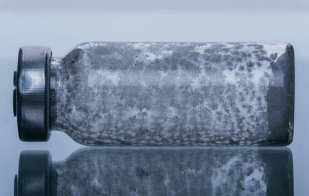 Sars-Kov-2 coronavirus vaccine in a transparent glass ampoule, covered with frost, on a dark background, short focus, toning