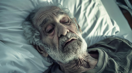 An elderly man rests peacefully in a hospital bed, surrounded by soft light and comforting shadows.
