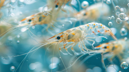 Close up View of Shrimp Swimming in Clear Water Showcasing Their Delicate Features and Bubbles on a Bright Day. Generative AI