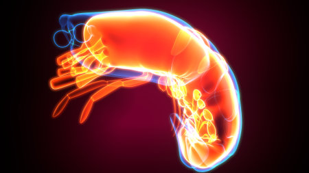 Closeup gills of shrimp under light microscope, Shrimp larvae under a microscope. Shrimp, White shrimp, Nauplius, Zoea, Mysis, Larvae. Background.