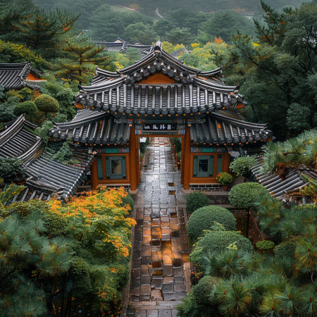 Asian architectural masterpiece with ornate roof details and vivid colors, highlighting cultural significance and artistic craftsmanship in a tranquil environment