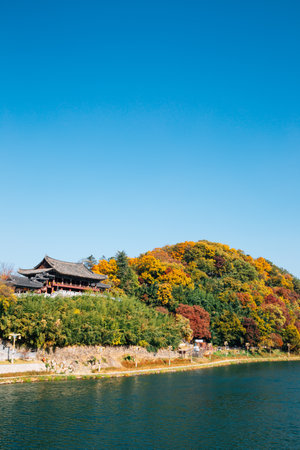 Yeongnamnu Korean traditional pavilion and autumn colorful mountain in Miryang, Korea