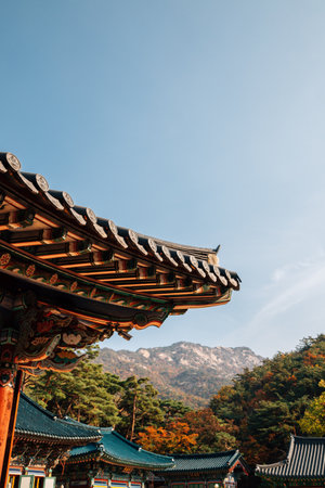 Jingwansa Temple with Bukhansan mountain at autumn in Seoul, Korea