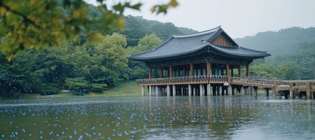Traditional Korean Pavilion by Serene Lake, Digital Outline Effect, Architecture, Tranquility