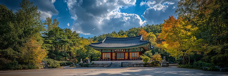 Serene Traditional East Asian Temple Building in Vibrant Autumn Colors Under Majestic Cloudy Sky