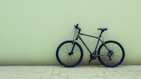 A gray bicycle rests against a soft green wall in a quiet outdoor setting during the late afternoon.