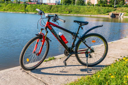 Bicycle on the embankment of the river in the evening