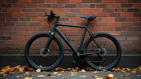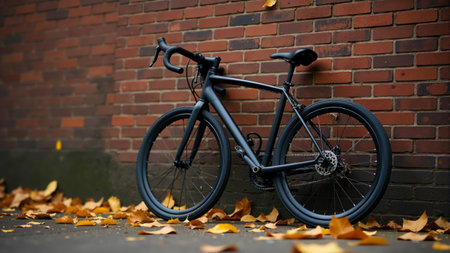 A sleek black bicycle leans against a textured red brick wall, surrounded by fallen yellow and orange leaves. The soft glow of dusk adds a serene atmosphere to the urban setting.