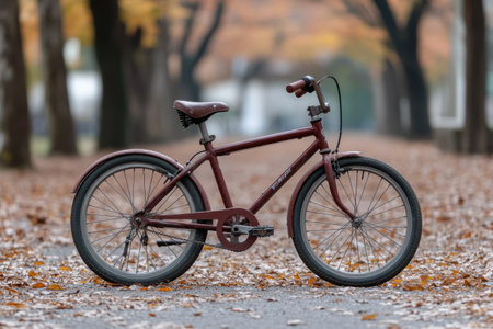 Bicycle in the park with fallen leaves in the autumn season.