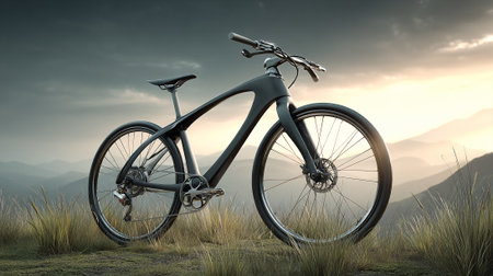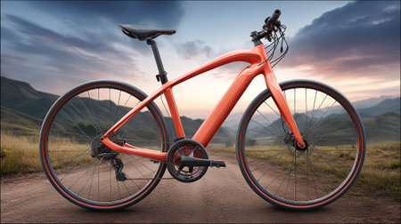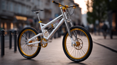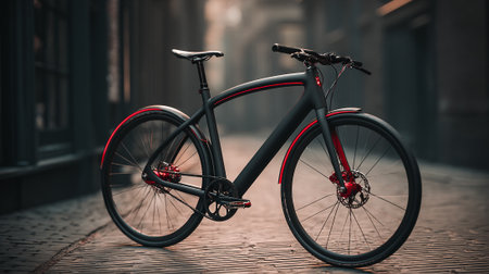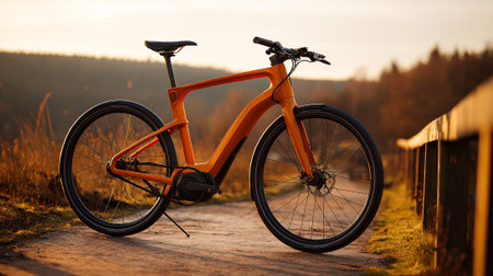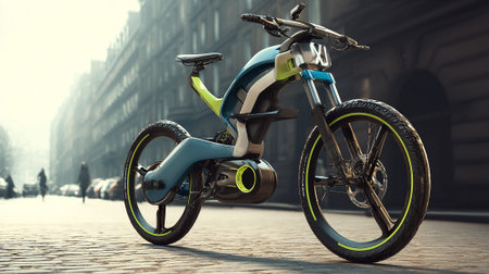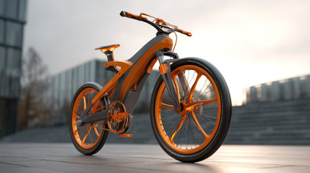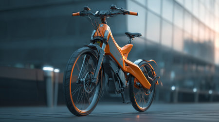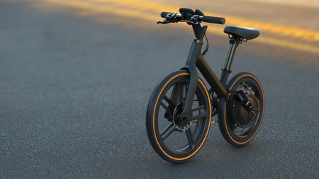 A sleek modern electric bicycle stands on an urban street at sunrise, showcasing advanced design and technology for eco-friendly commuting.