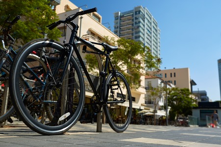 Tel Aviv Israel January 31, 2020 Closeup of bicycle parked in the streets of Tel Aviv in the afternoon