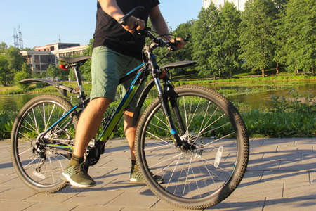 Close-up bicycle wheel on a forest path, active lifestyle, outdoor sports. High quality photo