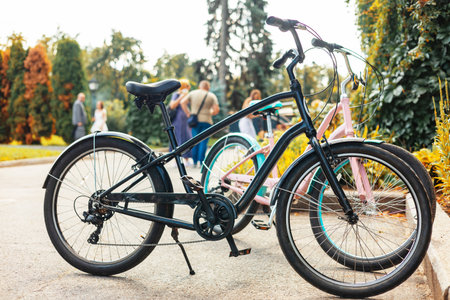 Bicycle on the city street in the evening, close-up