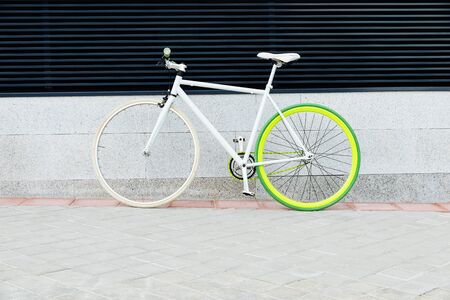 City bicycle fixed gear on wall. Cycling or commuting in city urban environment, ecological transportation concept.