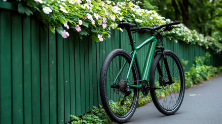 A green bicycle is parked next to a green fence. The bike is leaning against the fence and is surrounded by flowers. The scene has a peaceful and serene atmosphere, with the bike
