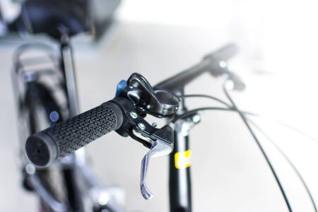 Mountain bike steering wheel on green grass background. Details of sporting events. Close up black mountain bike knob and derailleur knob, left shifter