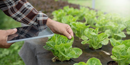 Farmer checking hydroponic red oak up in plant nursery farm. organic salad vegetable.
